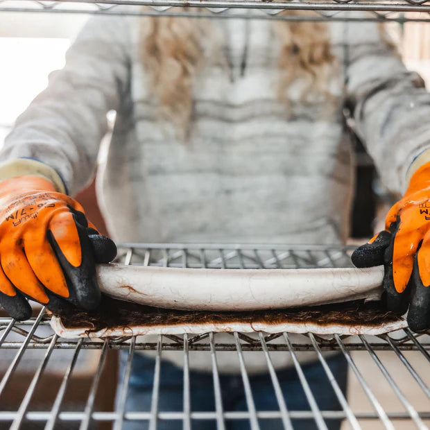We always knew that wasn’t what we wanted to be. We want to keep our chews as clean and natural as possible, which is why we take them immediately from the butcher to cleaning. There are two important parts of the cleaning process: washing and fleshing. Fleshing is the removal of excess fat and meat from the hide. One reason we flesh the hides is for caloric impact. If we left meat and fat on the hides, they could easily be several hundred calories each, which makes them incredibly unhealthy for a simple chew. The main reason is because both meat and fat will spoil and go rancid without some form of preservative, and we don’t want your dog to get sick. Washing, is of course used to clean the hides. These are cows that graze mountain pastures, so their hides often carry dirt, grass, leaves, manure, etc. that needs thoroughly washed.