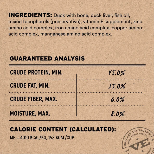 Duck with bone, duck liver, fish oil, mixed tocopherols (preservative), vitamin E supplement, zinc amino acid complex, iron amino acid complex, copper amino acid complex, manganese amino acid complex.